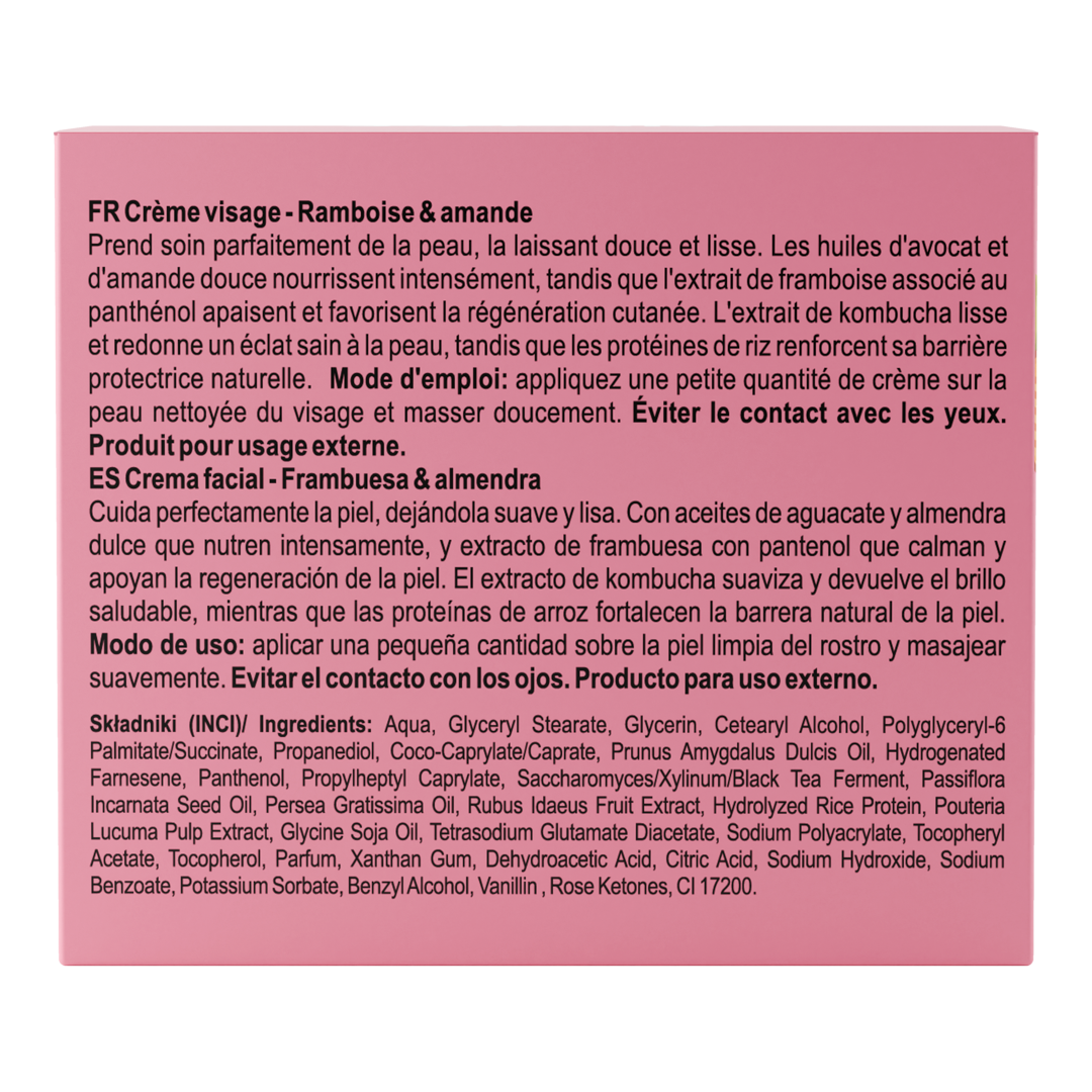 Ekstrakt z maliny – odżywia i nawilża skórę, wspiera jej regenerację oraz barierę lipidową, chroni przed utratą wilgoci i czynnikami zewnętrznymi, a dzięki polifenolom poprawia jędrność, elastyczność i blask cery.