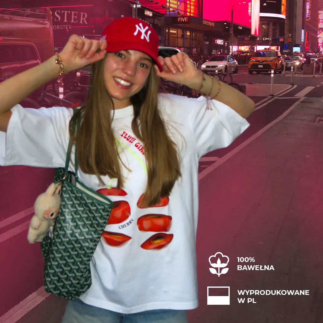 Wpadłaś w wiśniowy szał? Teraz możesz go pokazać całemu światu. Koszulka z limitowanej kolekcji Fluff x Blanapparel to nie jest zwykły T-shirt! To wisienka na torcie Twojej garderoby.